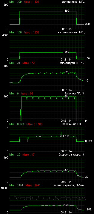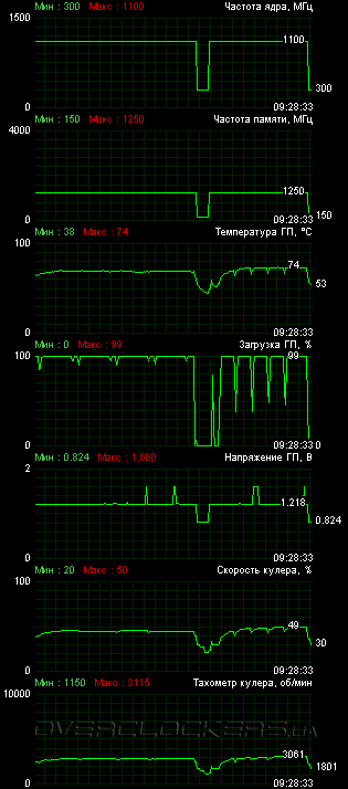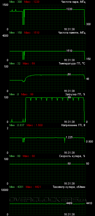 Стоит отметить, что даже при 4400 об/мин разогнанная карта легко прогревалась до 69 °C в Crysis: Warhead. Напряжение было повышено лишь до 1,225 В (на скачки в графике не обращаем внимание — это «глюки» мониторинга MSI Afterburner). С хорошим охлаждением вполне можно было бы надеться на большие частоты при большем напряжении.