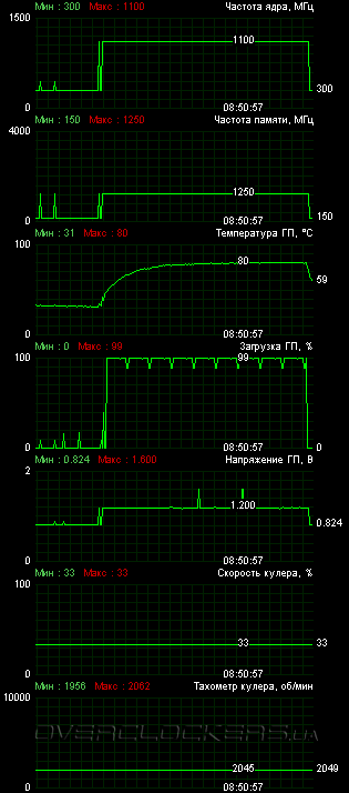 В данном случае без ручных регулировок просто не обойтись. Для достижения более комфортного уровня шума мы снизили напряжение питания ядра с 1,218 В до 1,2 В, зафиксировав обороты на уровне 33% (2045—2062 об/мин). В таком режиме карта сохраняла стабильность, но температура в Crysis держалась на уровне 80 °C.