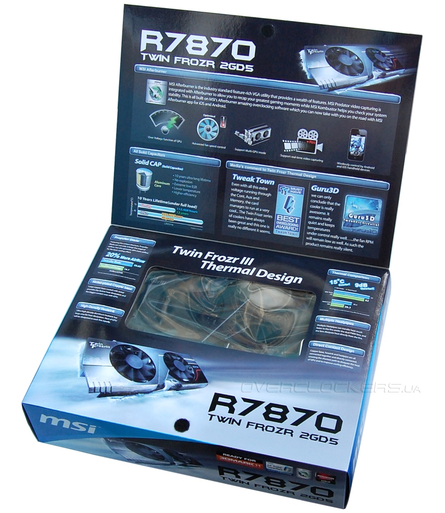 Видеоадаптер MSI R7870 Twin Frozr 2GD5/OC, как следует из названия, имеет повышенные рабочие частоты и оснащен фирменной системой охлаждения Twin Frozr. Поставляется в коробке с вполне традиционным оформлением.