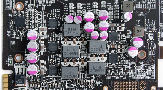 Графический процессор запитан от пятифазного преобразователя на микросхемах DrMOS производства Renesas Technology.