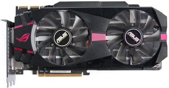 Видеокарта огромная. Внешне она не отличается от старых представителей линейки, например Matrix GTX580 P/2DIS/1536MD5. Лицевая сторона закрыта мощным кулером с двумя большими вентиляторами. На кожухе присутствуют характерные красные вставки и логотип ROG.