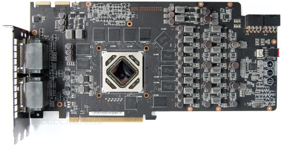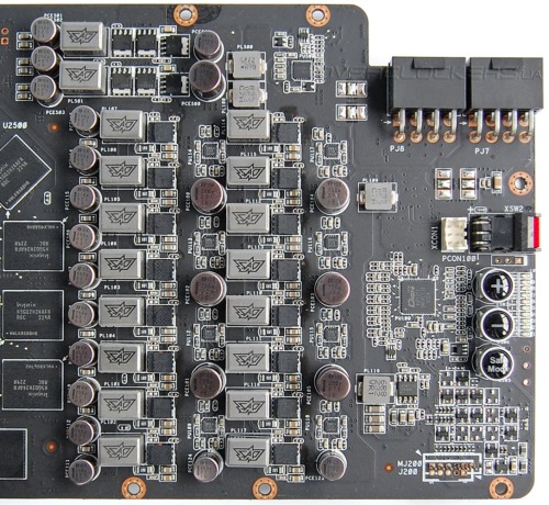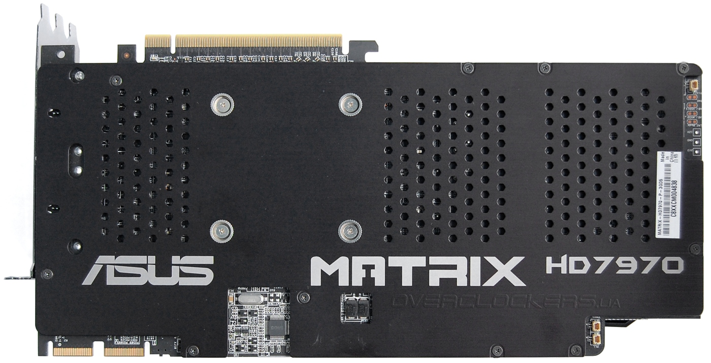 Дизайн PCB кардинально отличается от референсного. Система питания намного сложнее, и чтобы уместить все элементы на плате были увеличены размеры PCB. Последняя выполнена по технологии Super Alloy Power, что подразумевает использование высококачественных долговечных компонентов. Matrix-HD7970-P-3GD5 может похвастать 20 фазами, 16 из которых приходится на питание графического процессора.