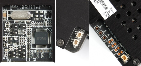 Обратная сторона платы накрыта перфорированном пластиной, которая оставляет открытыми лишь несколько зон на текстолите.