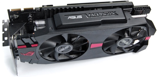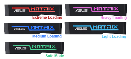 На боковой грани кожуха присутствует выступающий отсек с логотипами ASUS и MATRIX. Надписи подсвечиваются. Цвет подсветки меняется в зависимости от нагрузки — от зеленого в простое до красного при максимальной загруженности видеоадаптера.
