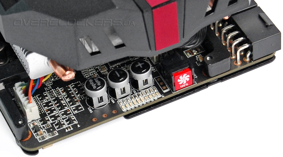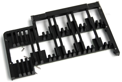 Что касается вентиляторов, то снять их проблематично. Винты, фиксирующие несущую рамку, закрыты декоративными элементами кожуха, которые посажены на клей. И для полного разбора нужно их отламывать. Поэтому фотографию вентиляторов мы не приводим. Тем более, что это стандартные 100-мм модели, которые используются во всех других ASUS DirectCU II.