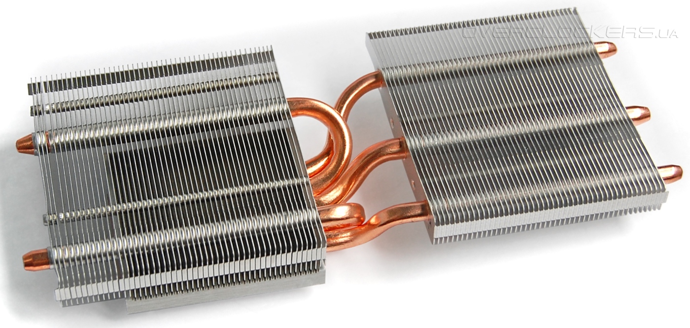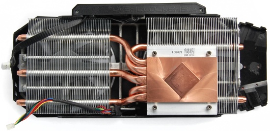 Однако радиатор все же отличается. Вместо шести тепловых трубок у топового Radeon оказалось пять, зато три из них увлеченного до 8 мм диаметра. При этом используется массивное медное основание. В более простых моделях ASUS трубки открыты со стороны чипа и контактируют с ним через небольшую напаянную площадку. Из-за размеров кристалла контакт с боковыми трубками был минимальный. Теперь же цельное основание будет отлично отдавать тепло всем трубкам.