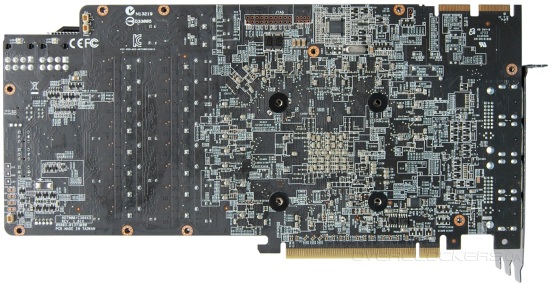 Видно, что под кулером плата накрыта толстой пластиной, которая выступает радиатором и предотвращает деформацию текстолита. В углу имеется два восьмиконтактных разъемов питания.