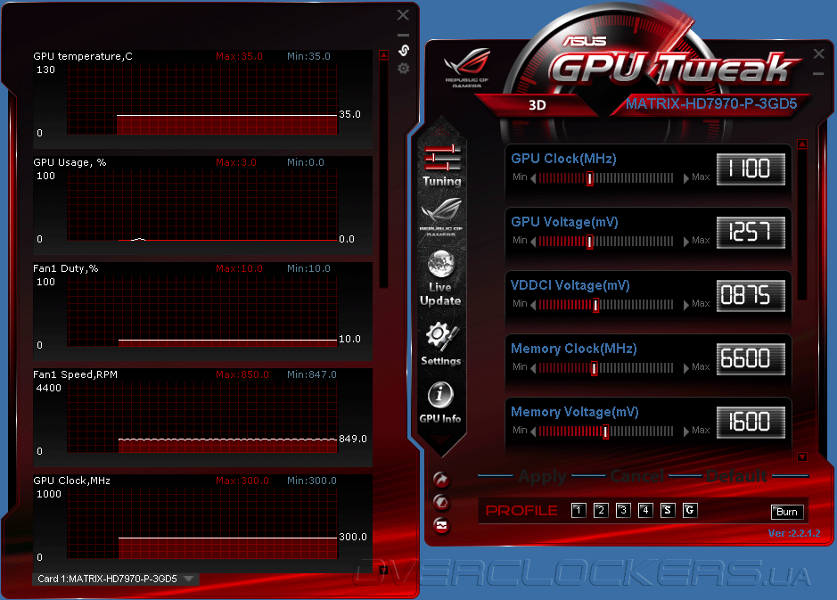 Заводской разгон внушительный: ядро функционирует на 1100 МГц, память на 6600 МГц. Стоит уточнить, что 1100 МГц — частота Boost, а базовая 1050 МГц. Но видеокарта все время работает на 1100 МГц и даже в своих презентациях ASUS зачастую озвучивает одно это значение как основное и единственное. Для простого Radeon HD 7970 рекомендованные частоты 925/5500 МГц. У GHz Edition базовая частота 1000 МГц при Boost 1050 МГц и 6600 МГц у памяти GDDR5.