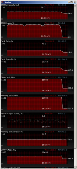 Нагрузив ASUS нашим стандартным 12-минутным тестом Crysis: Warhead, мы прогрели GPU до 76°C при 23,5 °C в помещении. Вентиляторы в таком режиме работали на скорости 2030 об/мин.