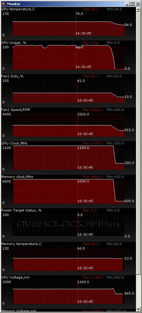 Чем ASUS не порадовал, так это своим энергопотреблением. Даже в номинале его аппетиты выше чем у остальных участников при разгоне. Но это можно легко вылечить снижением рабочего напряжения. Как мы писали выше, оно слишком завышено, но видеокарта легко работает и при более низких его значениях.