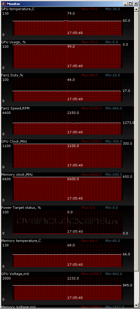 Данное приложение для столь мощной видеокарты не создаст максимальную нагрузку. А вот тест MSI Kombustor вполне позволит судить о температурах и шуме в самых тяжелых игровых приложениях. При 10 минутах этого теста пиковая температура ядра достигла 79 °C, а вентиляторы раскрутились до 2150 об/мин. Массивные «вертушки» при таких оборотах создают уже весьма заметный и неприятный гул.
