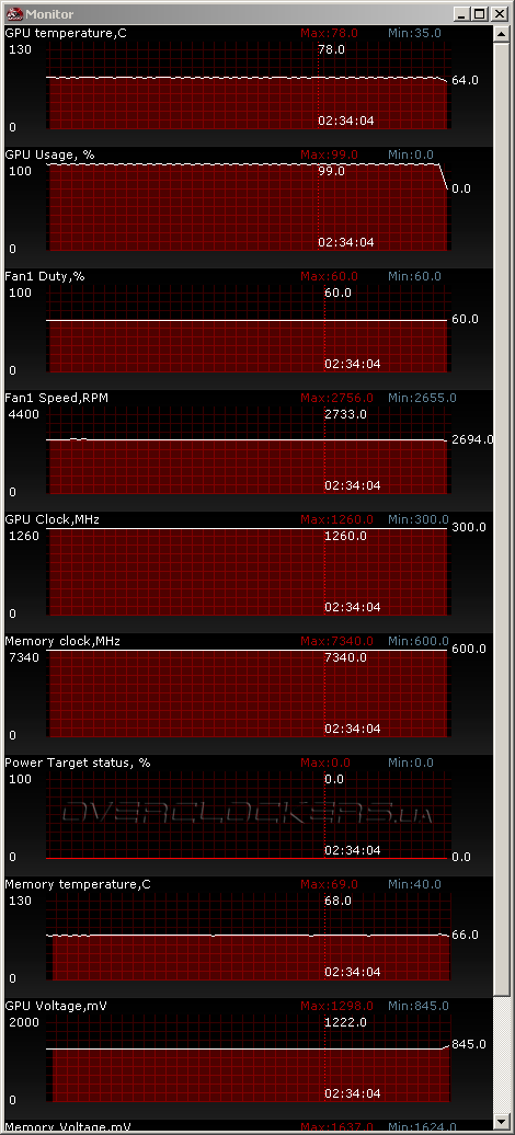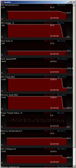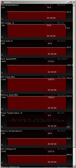 Видеокарту можно сделать тише и холоднее. Производитель изрядно подстраховался и установил в номинале напряжение 1,257 В (согласно мониторингу оно чуть ниже). Понизив его до 1,207 В (1,197 В по программному мониторингу) и зафиксировав обороты вентиляторов на 37% (примерно 1820 об/мин) мы получили 74 °C в Warhead.