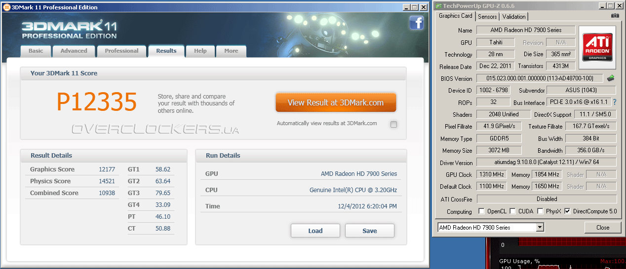 ASUS почти на 14% лучше обычной версии Radeon HD 7970 и на 2% быстрее GeForce GTX 680. Но лидирует в номинале Palit JetStream. При разгоне до 1260/7340 МГц рассматриваемый видеоадаптер проигрывает ускоренному Palit жалкие доли процента, а на частотах 1300/7400 МГц уже обгоняет его.