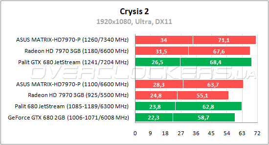 Во втором Crysis 2 у Matrix внушительный отрыв в 27% над GeForce GTX 680 по минимальному fps и преимущество в 9% по среднему показателю. При разгоне снова никто не может поколебать лидерские позиции ASUS.