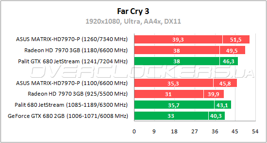 В Battlefield 3 в номинале Matrix обгоняет простой GeForce GTX 680, но уступает Palit JetStream. Зато при разгоне ASUS уже выходит в лидеры, пускай и с минимальным отрывом от конкурента NVIDIA.