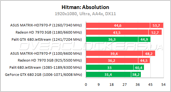 Если обычный Radeon уступает флагману NVIDIA в Warhead, то Matrix уверенно обходит его и даже обгоняет Palit по среднему fps. При разгоне ASUS тоже нет равных, хотя по минимальному показателю JetStream уступает совсем немного.