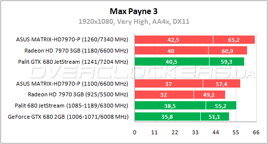В Max Payne 3 по среднему fps лидирует ASUS Matrix, но у Palit JetStream меньше просадки. В разгоне лидерство Matrix-HD7970-P-3GD5 неоспоримо.