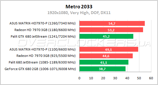 Ну а в Metro 2033 продукт NVIDIA и вовсе не может составить хоть какую-то конкуренцию ASUS. Даже разогнанный GeForce слабее работающего в номинале Matrix-HD7970-P-3GD5.