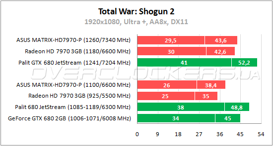 В этой игре ASUS снова уверенно обходит GeForce GTX 680 и обгоняет ускоренную версию от Palit по среднему fps. При разгоне ситуация не меняется. Но стоит отметить совсем небольшое преимущество над более простым Radeon HD 7970 в 3–4%, хотя разница по частотам между форсированными представителями AMD больше.