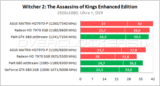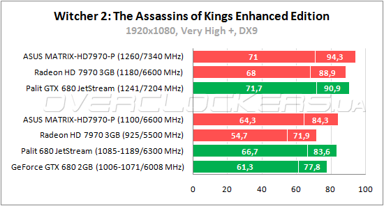 Во втором «Ведьмаке» результаты ASUS Matrix и Palit JetStream примерно идентичны в номинале, а при разгоне представитель AMD немного быстрее.