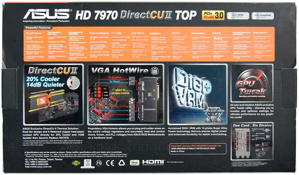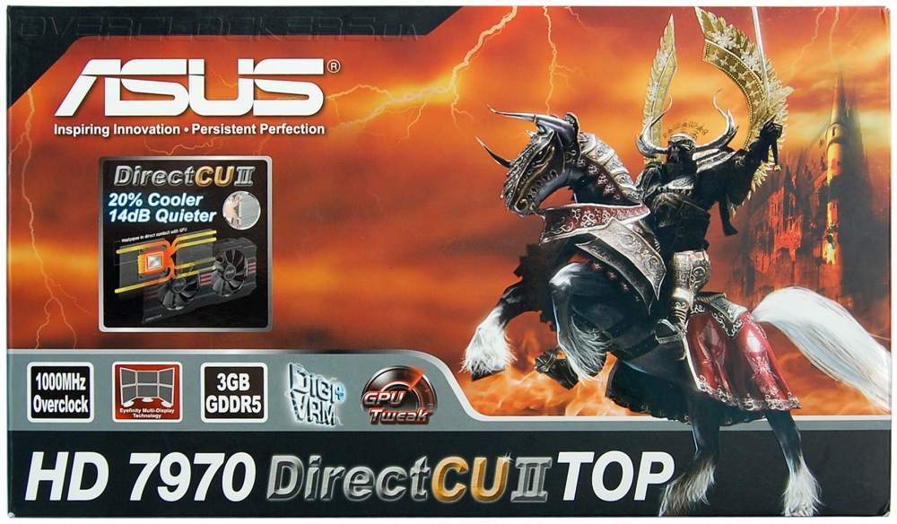ASUS HD7970-DC2T-3GD5 — качественно сделанная видеокарта с усиленной системой питания и мощным охлаждением. В пору ожидать низких температур при низком уровне шума. На деле все оказалось иначе. Наш экземпляр был не холоднее и не тише референса. Все дело в очень высоком тепловыделении графического процессора, о чем свидетельствует и не менее высокое энергопотребление всей видеокарты. Возможно, к нам в руки попал какой-то неудачный экземпляр. Хотя и в таком варианте карта может стать тише и холоднее при ручных регулировках — с этим нет проблем. Да и продемонстрированный разгонный потенциал выше средних возможностей Radeon HD 7970. Еще карта порадовала хорошим разгоном при невысоких оборотах крыльчаток вентиляторов. Начальный заводской разгон дает преимущество над референсом в 5—8%, а разгон в тихом режиме позволяет добиться общего преимущества до 15—18%. Конечно, рабочие температуры при этом уже очень высокие. Но такой разгон (и даже больший) вполне реализуем в корпусе с хорошей вентиляцией, особенно, если на боковой стенке есть вентилятор для обдува видеокарты. Так что общее впечатление от нашего экземпляра все-таки неплохое. Да и внешний вид у ASUS очень солидный. Плюс есть надежда, что в большинстве своем представители этой серии не такие горячие, как карта, попавшая к нам в руки, и они изначально холодные и тихие без вмешательства пользователя в их настройки.