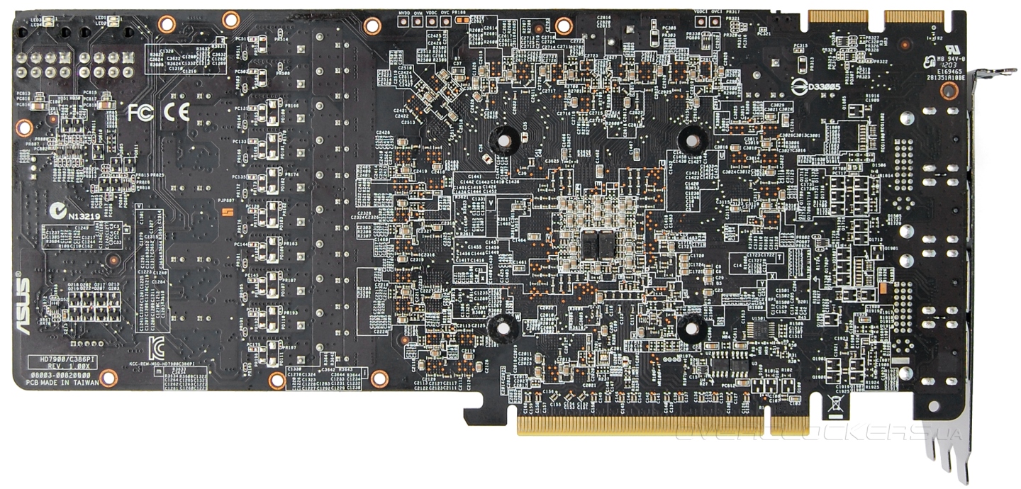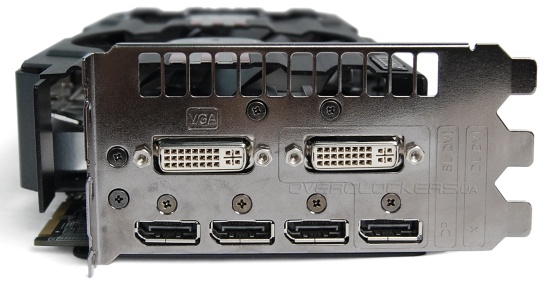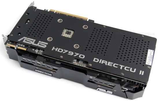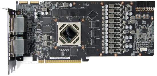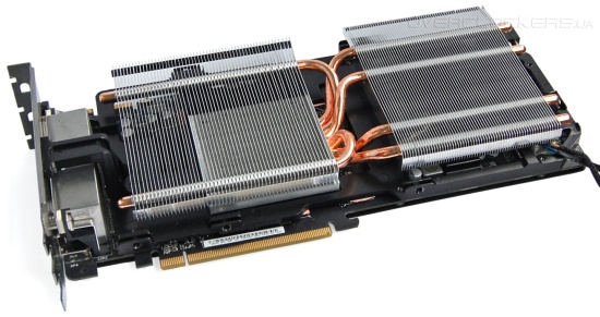 Сбоку мы видим два восьмиконтактных разъема питания, тогда как стандартная версия Radeon HD 7970 оснащается разъемами на шесть и восемь контактов.