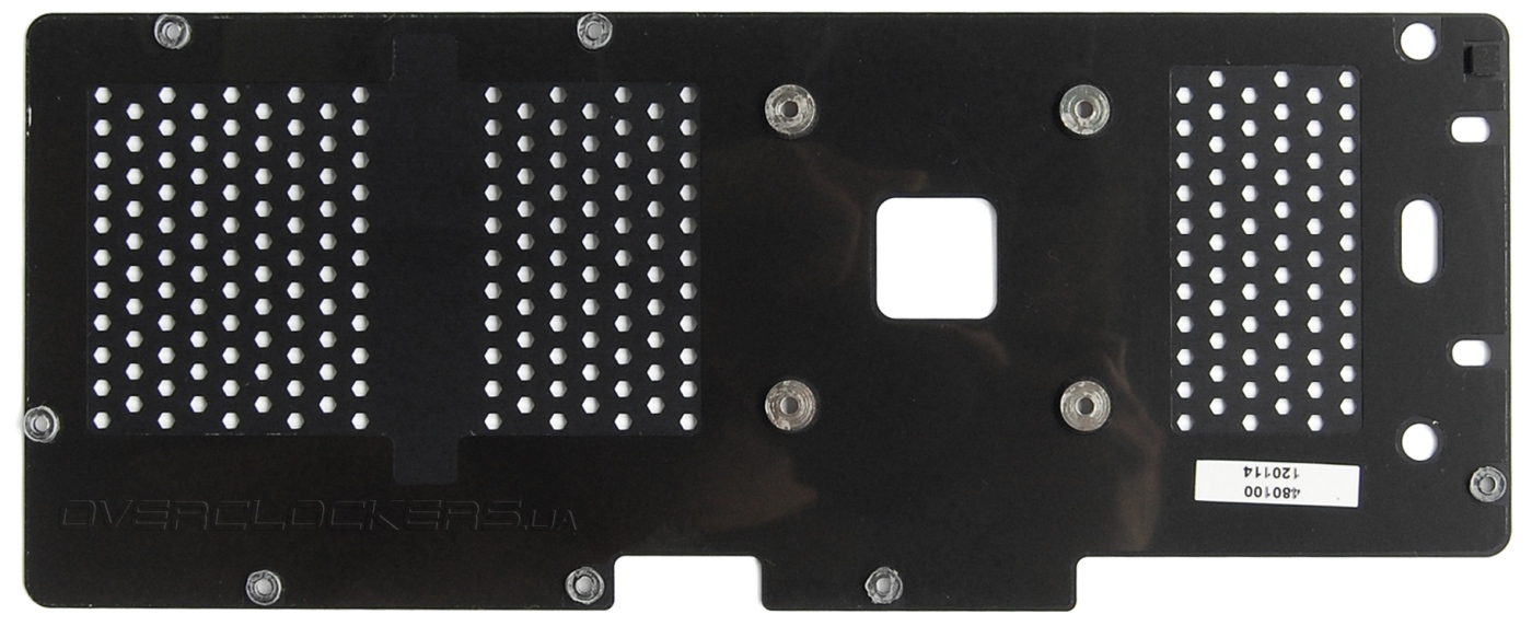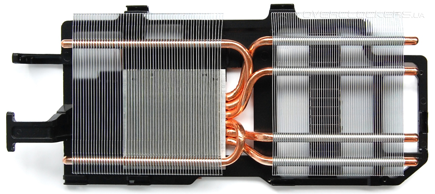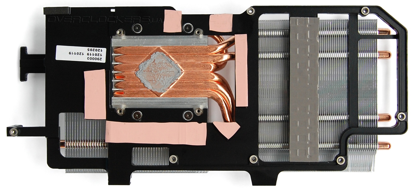 Теперь давайте рассмотрим в деталях систему охлаждения. В отличие от упоминавшегося Radeon HD 7950 рассматриваемый графический ускоритель обзавелся большим радиатором, накрывающим микросхемы памяти и силовые компоненты системы питания. Эта пластина играет роль основания всей конструкции. К ней прикручен радиатор графического чипа. И надо сказать, прикручен так, что мы в итоге так и не смогли снять основной радиатор.