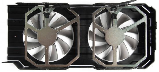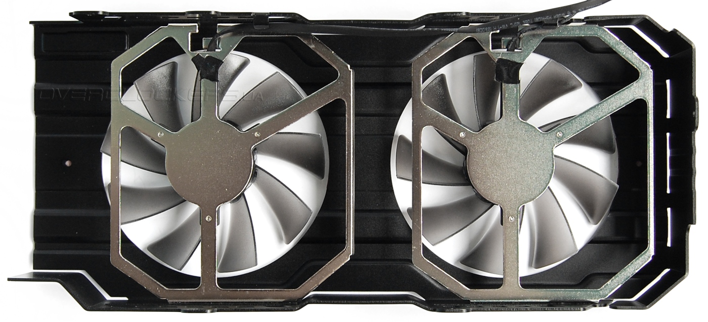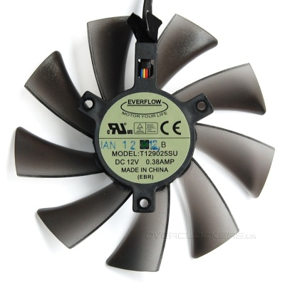 Что касается последних, то это парочка Everflow с маркировкой T129025SU. Судя по обозначению это модели размером 92 мм, но фактически это реальный диаметр их лопастей. И правильнее говорить, что на видеокарту установлены вентиляторы типоразмера 100 мм. Такими гигантскими «мельницами» может похвастать еще только MSI R7970 Lightning.
