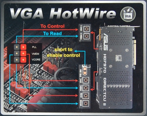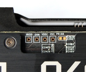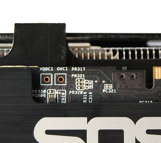 Плата выполнена по фирменной технологии Super Alloy Power, что подразумевает использование высококачественных и долговечных компонентов. Продукт ориентирован на разгон и эксперименты при сверхнизких температурах в частности. Поэтому не обошлось без точек для замера рабочих напряжений, которые для удобства пользователя заботливо вынесены на край платы. Эта функция называется VGA Hotwire и она позволяет не только измерять, но и менять напряжения. Включается такой режим контроля замыканием двух контактных площадок.