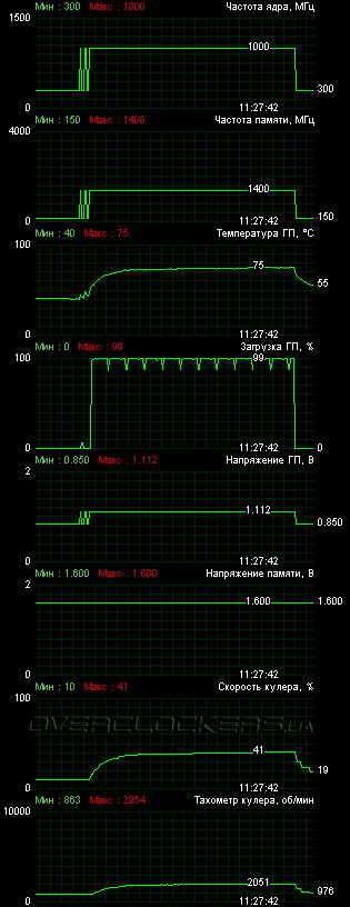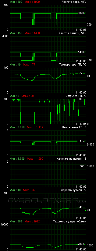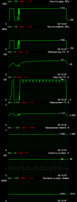 Потом мы постарались найти максимально стабильные частоты при максимальных оборотах, т.е. при самом эффективном охлаждении. Превзойти результат Lightning с 1190/7200 МГц не удалось. Основной проблемой стали артефакты на очень высоких частотах GPU. Хотя в некоторых приложениях наблюдалась относительная стабильность и на 1,2 ГГц. После долгого подбора частот пришлось ограничиться 1170/7160 МГц. Хотя после длительной нагрузки и на такой частоте у нас возникли небольшие артефакты в «Ведьмаке», поэтому частоты были еще снижены до 1165/7160 МГц. На нижнем скриншоте вы видите график нагрузки при частотах 1170/7160, но результаты на итоговых графиках получены именно при 1165/7160 МГц. Напряжение для стабильной работы пришлось повысить до 1,137 В.