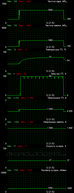 Для достижения комфортного уровня шума мы понизили обороты и напряжение до 1,05 В. И в таких условиях при 1850 об/мин карта в Crysis не грелась выше 73 °C. Вышло не только тише, но и холоднее.