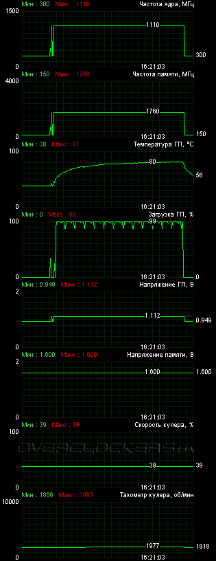 Для разгона мы использовали MSI Afterburner. В качестве альтернативы можно использовать фирменную утилиту ASUS GPU Tweak с идентичной функциональностью. Для начала была поставлена цель достичь высоких частот при невысоком уровне шума. Скорость вентиляторов была зафиксирована на 39% (1943—1977 об/мин), напряжение не поднималось. Итогом стал стабильный разгон до 1110/7000 МГц. 12-минутный тест Crysis прогрел ядро до 81 °C. Ну а пиковая температура по итогу всех тестов была еще на три градуса выше.