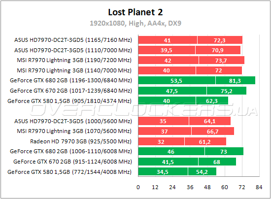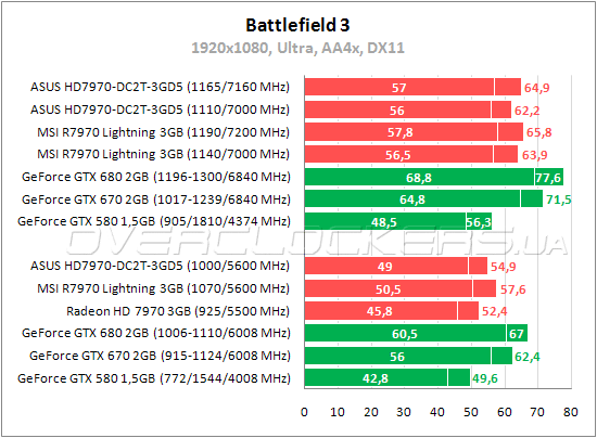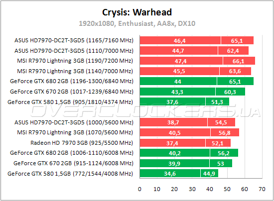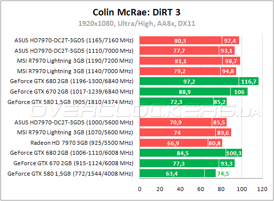 Игра благосклонна к видеокартам NVIDIA и все Radeon HD 7970 проигрывают GeForce GTX 670. Преимущество ASUS над референсом достигает 9% по минимальному fps и 5% по среднему.