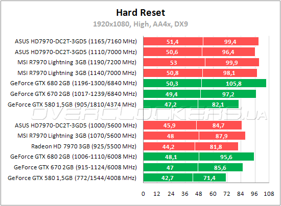 В игре Hard Reset карта ASUS в номинале чуть-чуть не дотягивает до GeForce GTX 670. При разгоне в тихом режиме герой нашего обзора немного обходит разогнанного конкурента по минимальному fps.