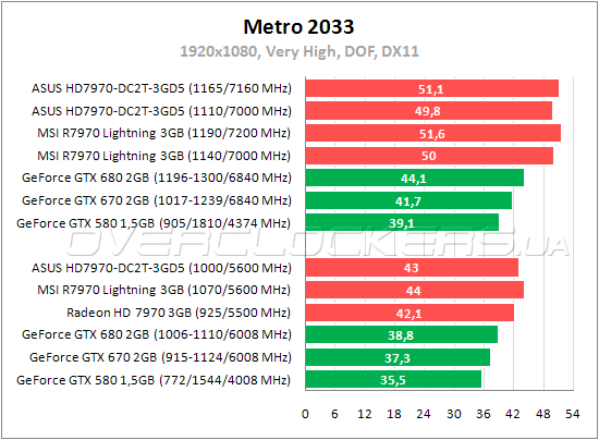 В Metro 2033 представители AMD реабилитируются за прошлые игры и уверенно обгоняют новинки NVIDIA на базе GPU Kepler. ASUS HD7970-DC2T-3GD5 обходит GeForce GTX 680 на 11%.
