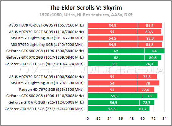 В Skyrim по среднеигровому fps ASUS почти не уступает GeForce GTX 680, а по минимальному хуже GeForce GTX 670.