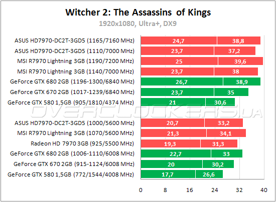 Во втором «Ведьмаке» без разгона ASUS слабее GeForce GTX 680 в более простом режиме, а в «запредельном качестве» почти не уступает сопернику. Разгон в тихом режиме дает прирост 11—14%.