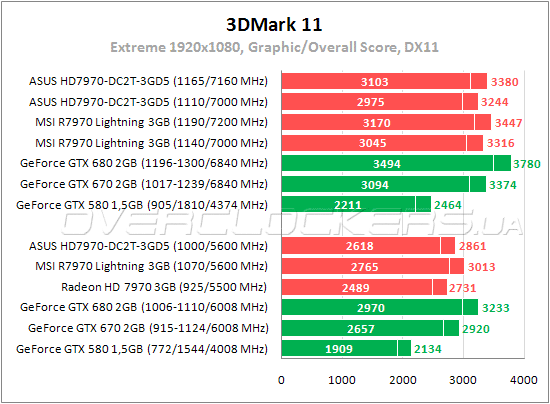 А вот в этом тесте все Radeon HD 7970 не дотягивают и до GeForce GTX 670. ASUS выигрывает у референсной карты 6%. Разница с Lighting в номинале менее 5%. Разгон до частот 1110/7000 МГц дает прирост в 9—10%.