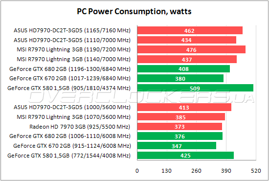 Замеры потребляемой мощности производились в восьми приложениях. Для Radeon HD 7970 напряжение в номинале и при разгоне — 1,17 В и 1,218 В; для Radeon HD 7950 — 0,993 В и 1,068 В. Референсный GeForce GTX 580 работал на 1,0 В (1,012 В в Crysis 2) в номинале и 1,113 В при разгоне. Напряжение видеокарт на базе GK104 варьируется в зависимости от частот, которые повышаются и снижаются в зависимости от потребляемой мощности.