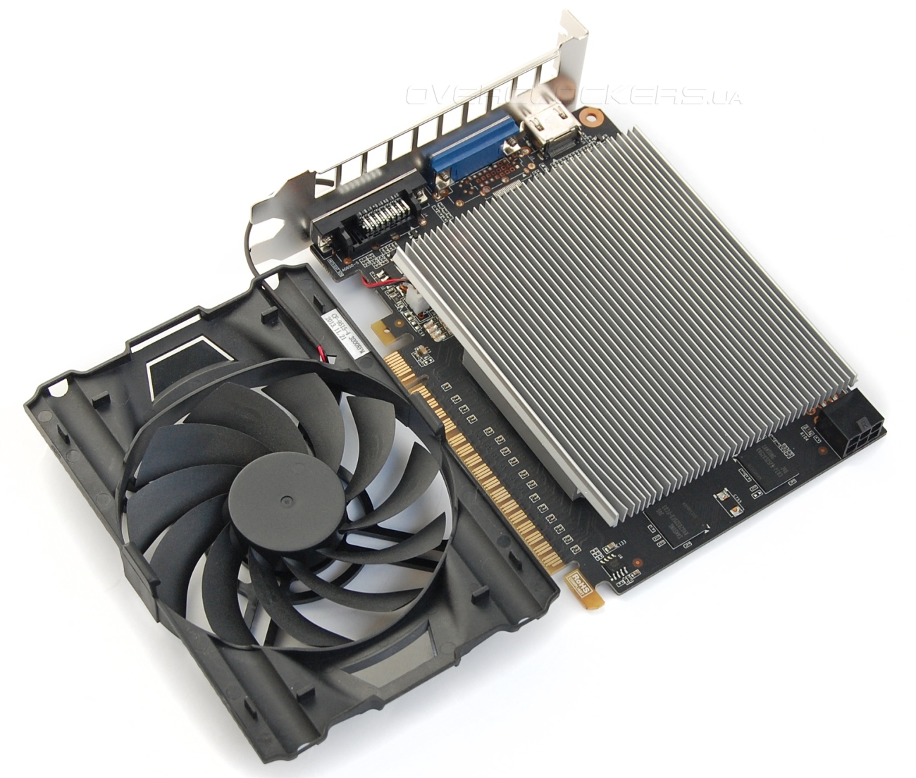 Алюминиевый цельный радиатор не намного меньше самого кожуха, как это было у ASUS. Вентилятор типоразмера 100 мм (диаметр крыльчатки меньше). Стоит отметить и большое количество лопастей, что положительным образом сказывается на мощности создаваемого воздушного потока.