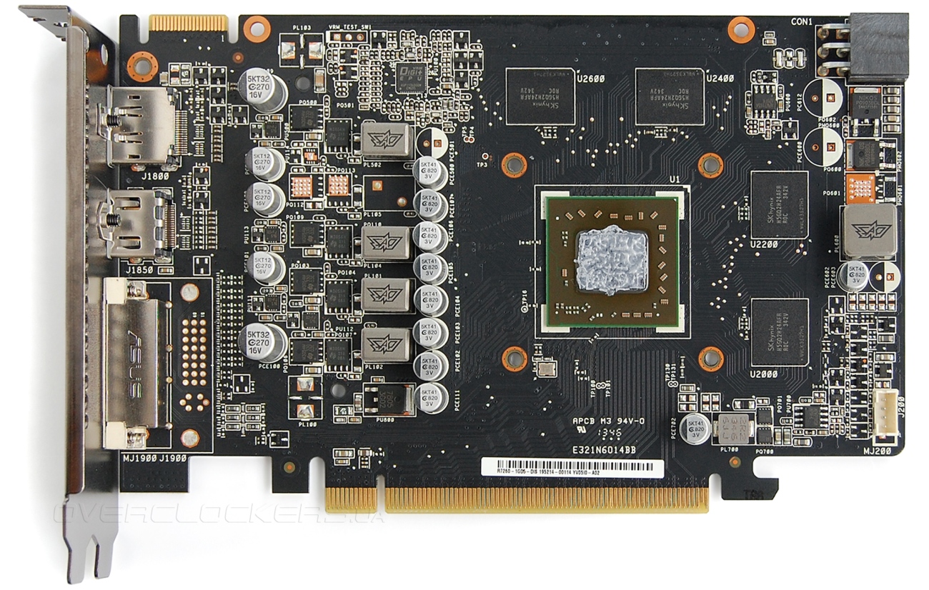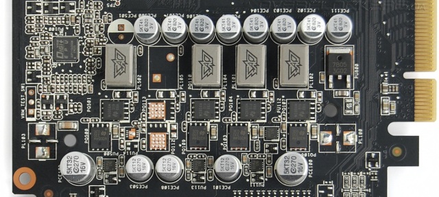 Не распаяна одна из пяти фаз питания графического процессора. Используются высококачественные компоненты, отвечающие внутреннему стандарту компании Super Alloy Power. Никакого радиатора на элементах узла питания нет, хотя соответствующие монтажные отверстия присутствуют.