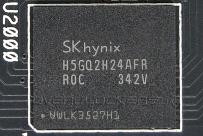 Гигабайт памяти набран четырьмя микросхемами SKhynix H5GQ2H24AFR R0C.