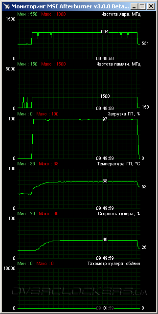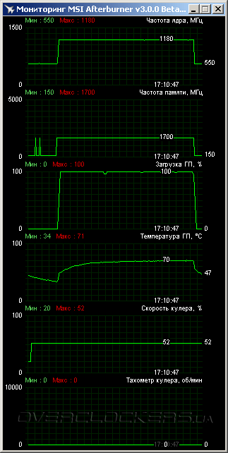 Результат довольно хороший, не намного хуже показателей Gigabyte GV-R726XOC-1GD. Скорость вентиляторов была чуть повышена, никакого акустического дискомфорта это не вызвало.