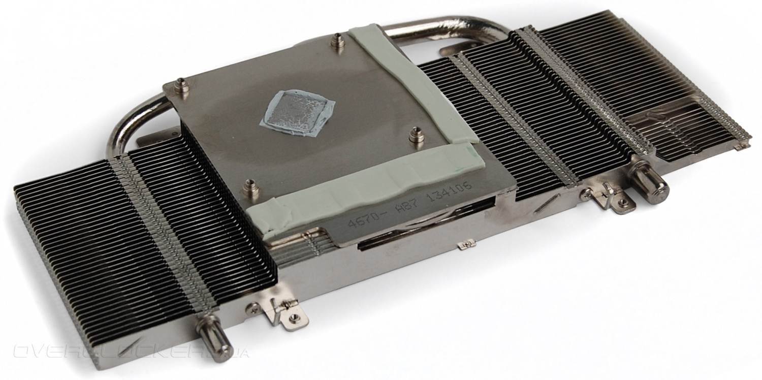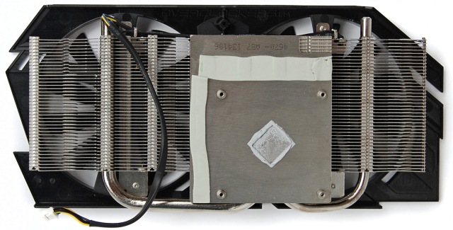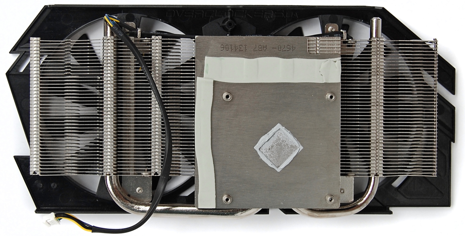 Охлаждение действительно претерпело изменений относительно более мощных видеокарт. Радиатор меньшей длины и с меньшим числом пластин. Основание очень крупное. Оно одновременно контактирует с чипом GPU и микросхемами памяти вокруг него. Но половина микросхем накрыта основанием частично, поэтому на нижней фотографии левая термопрокладка такая узкая.