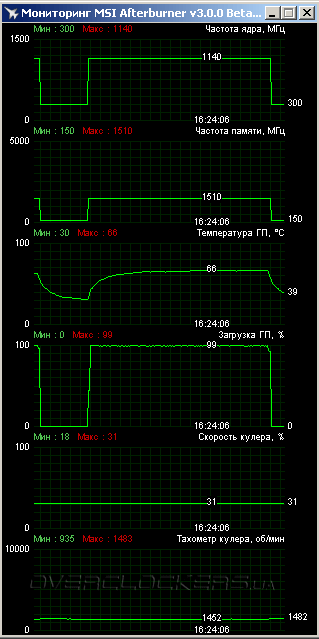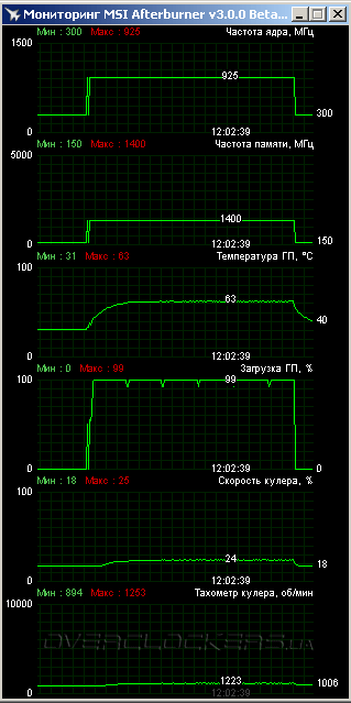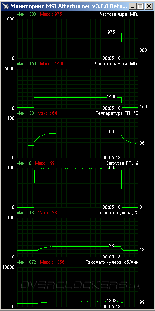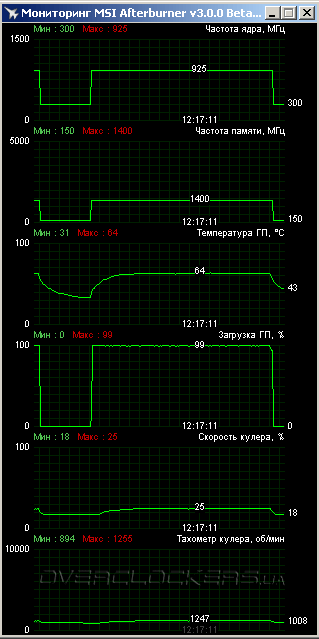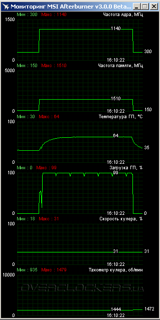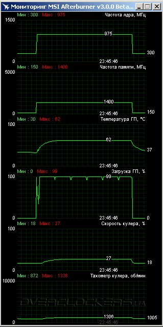 Прогрев видеокарты осуществлялся двумя тестами в течение 12 минут. В первом случае это демо Ambush из Crysis Warhead Benchmarking Tool при максимальных настройках графики и сглаживании MSAA 8x в разрешении 2560x1440. Во втором случае задействовался Unigine Valley benchmark на Ultra-качестве со сглаживанием MSAA 4x. В открытом корпусе при 23–24 °C в помещении карта не прогрелась выше 62–64 °C. Шум при этом практически отсутствовал, ведь вентиляторы раскручивались только до 1300–1350 об/мин. Чтобы услышать их в таком режиме, нужно наклоняться к самой видеокарте.