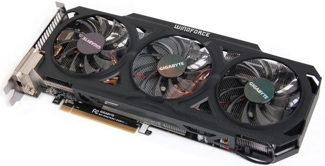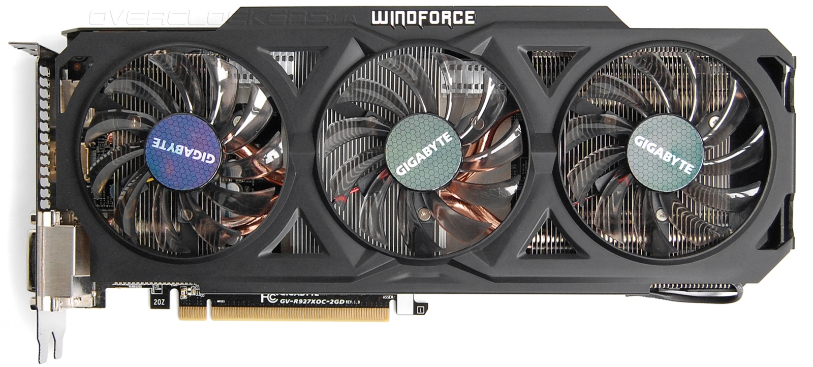 Видеокарта выглядит вполне традиционно для старших моделей Gigabyte, оснащенных системой охлаждения Windforce с тремя вентиляторами.
