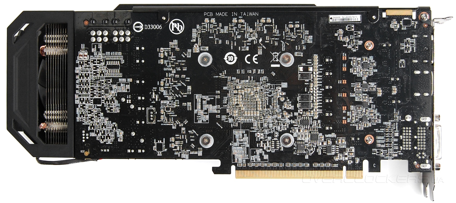 Плата оказалась довольно короткой. При общей длине в 28,5 сантиметров текстолит не дотягивает и до 24 сантиметров. Нависающий сбоку кулер прикрыт пластиковым поддоном с окошком. Похожие конструкции мы наблюдали и у многих других производителей, но в основном среди более дешевых карт.