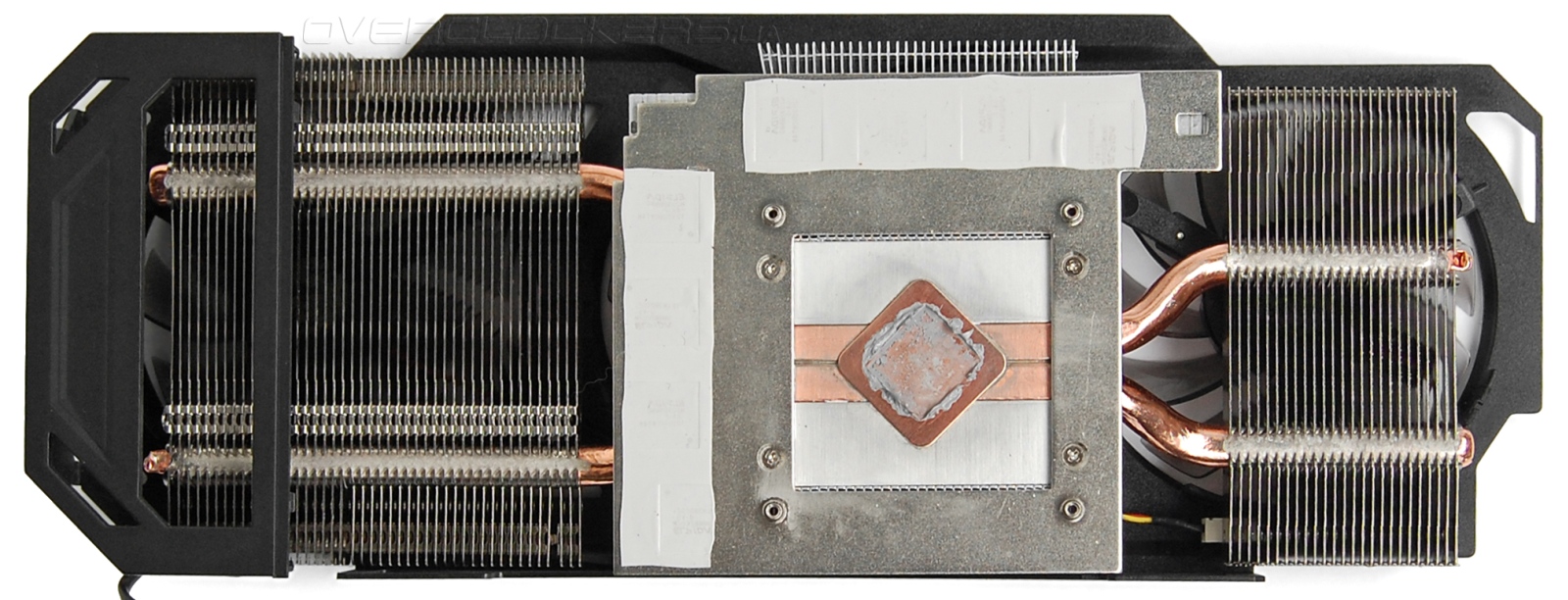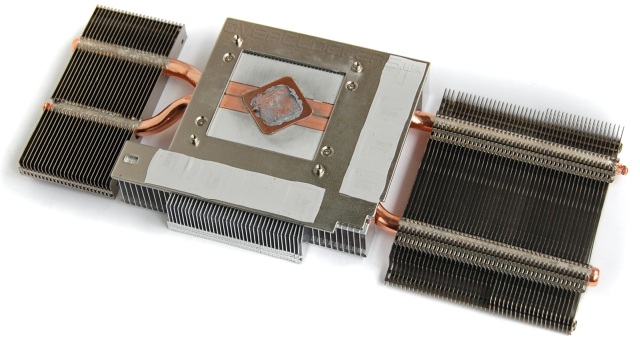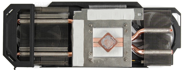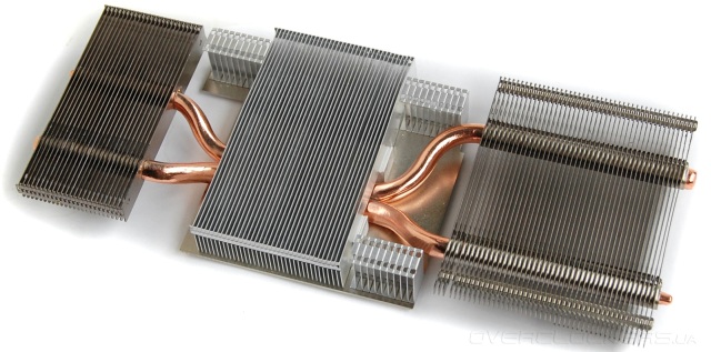 На первый взгляд система охлаждения очень напоминает ту, что охлаждала предшественника в лице Gigabyte GV-R787OC-2GD. Алюминиевое основание обеспечивает контакт с микросхемами памяти. Теплосъемником для GPU служит медная пластина, контактирующая с двумя тепловыми трубками диаметром 8 мм.