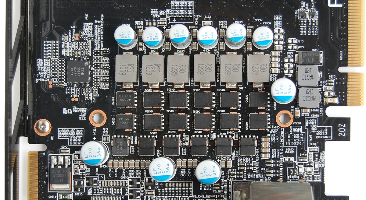 Система питания памяти насчитывает две фазы. Графический процессор запитан от шестифазного преобразователя под управлением контроллера IR3567A.