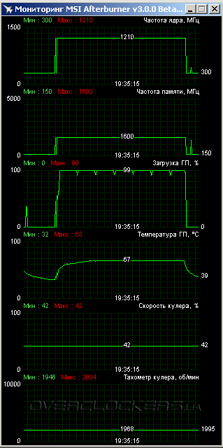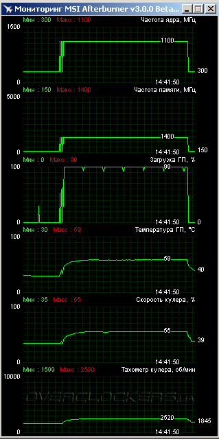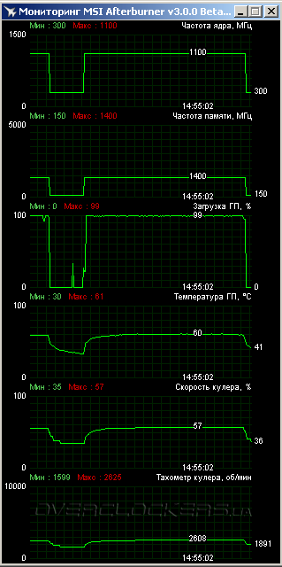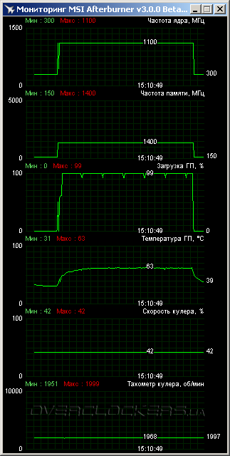 Уровень шума умеренный, но все же присутствует. По верхним скриншотам можно наблюдать, что вентиляторы раскручиваются до 2500–2600 об/мин. Это очень большие значения, но сами вентиляторы у Gigabyte довольно тихие, так что реального дискомфорта в таком режиме нет. Можно прибегнуть к ручным настройкам для уменьшения шума. Зафиксировав обороты на 42% (менее 2000 об/мин), мы прогрели карту в Crysis лишь до 63 °C. Рост температур при понижении шума минимальный, что не может не радовать.